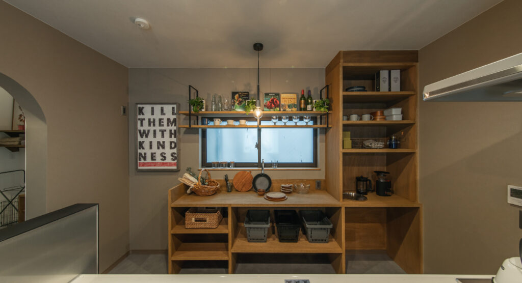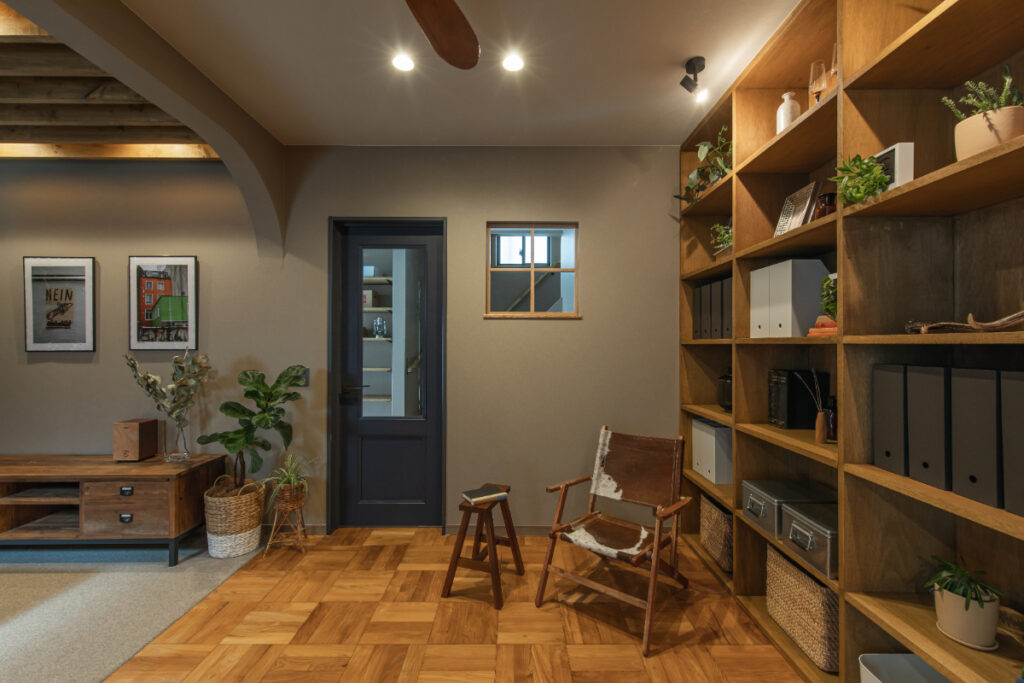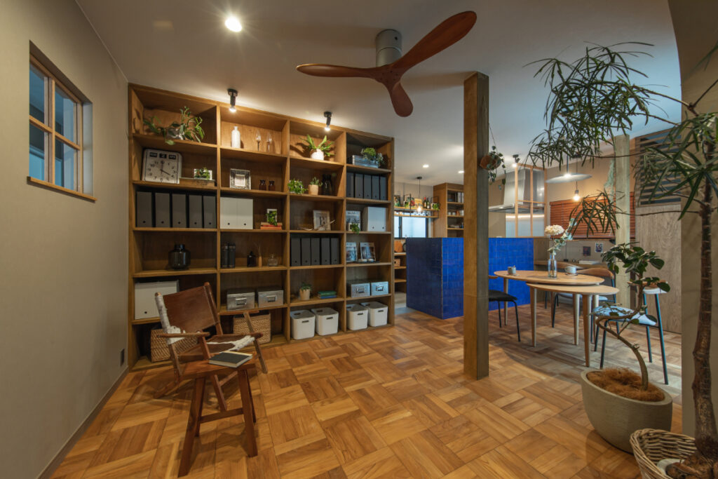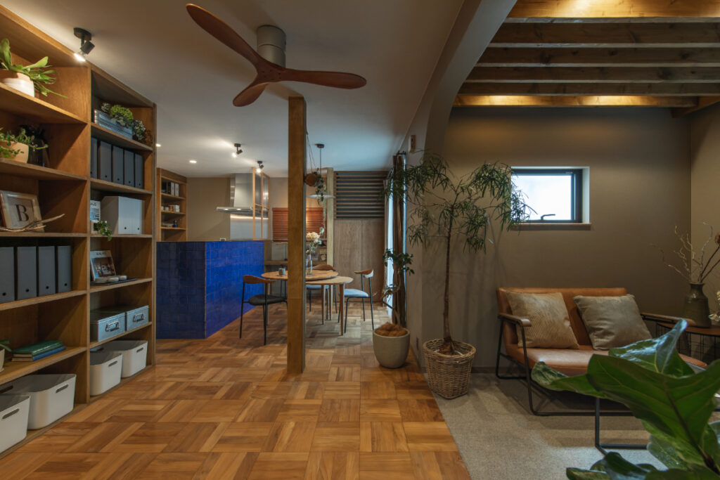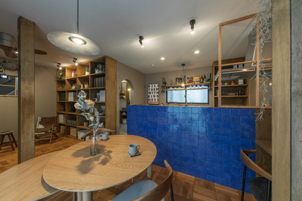 戸建住宅をフルリノベーションし、新築にも遜色のない住宅に仕上がりました。メリハリを付けた1階のLDKには、こだわりを詰め込んだオンリーワンの空間が広がります。キッチン腰壁のブルーのタイル、梁をふんだんに使用したリビング天井、そして特徴的なパーケットフローリングが空間を構成します。